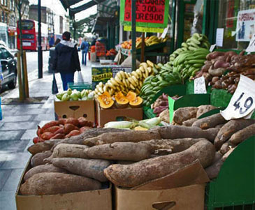 ロンドンの八百屋に並ぶ西アフリカのヤム。1本0.49£。('05 Sep. Finsbury Park) → もっと詳しく