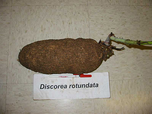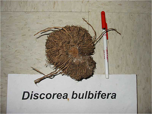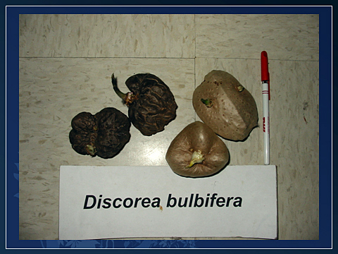 地下のイモは小さく偏球形もしくは不定形で食用にはしない。一方,食用とされるムカゴは非常に大きくなり,しばしば2kgに達する。これは茶褐色の偏球形で,アジア原産のカシュウイモと異なって明らかな稜がある。肉色は白色,アルカロイドを含むため長時間煮て供される。栽培期間は8~10ヵ月で,イモの休眠は3~4ヵ月である。 |