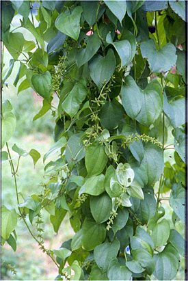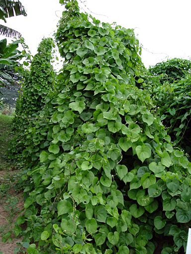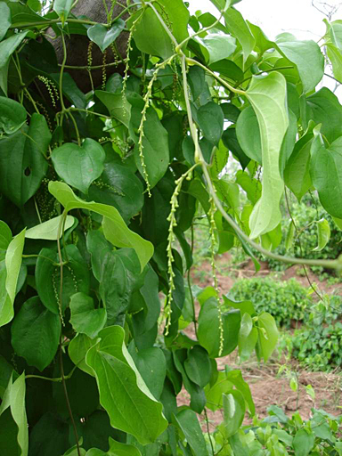 | 東南アジア、パプアニューギニアで生産が多い。アフリカでは西および中央アフリカの熱帯雨林から湿潤サバンナ地域で栽培される。つるは左巻き,茎は断面が円筒形でとげがある。葉は幅広い心臓形で互生し,葉柄の基部にもとげがある。花はほとんど見られない。 |
