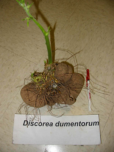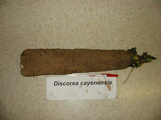 イモは茶褐色の紡錘型で,肉色は白,肉質はち密で,含水率は60~70%,「とろろ」は日本のナガイモなどに比べて粘りが少ない。肥沃な土地で大きな種イモを用いて栽培すると10ヵ月で25kg位まで成長する。一般に,一株から一個のイモが収穫されるが,ベナン共和国には複数のイモをつける品種もある。イモは2~3ヵ月の休眠を有する。 栽培期間は早生品種で6ヵ月,晩生品種で10ヵ月程度である。早生品種は湿潤サバンナの疎開林まで分布するが,晩生品種は熱帯雨林から低緯度の湿潤サバンナで栽培される。 |