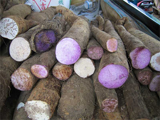 イモの重さは5~10kg位で,形は紡錘形,丸形およびイチョウ形まで変異に富んでいる。イモの表皮は茶褐色から暗褐色で,縦に割れ目がはいる。肉色は白色が多いが、アントシアニンを含んだ暗赤色や紫のイモもある。肉質の緻密さはホワイトギニアヤムに比べてやや劣る。収穫時の含水率は70~75%である。イモは2~3ヵ月の休眠を有する。栽培期間は早生品種で8ヵ月,晩生品種で10ヵ月である。 |