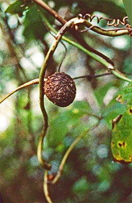 | アケビドコロの分布域は東アジアの熱帯から亜熱帯であり、日本には沖縄本島の一部にだけ生育している (写真左、1980年11月10日 沖縄県本部半島)。 Lasiophyton 節の他の種と同じように、葉脈は単子葉とはとても思えないパターンをしている。日本のものはメス株だけであり、種子の形成は見られないが、東南アジアからネパールにかけてのこの種の主要な分布域では、オス株もあり、メス株には種子が形成される。この種はムカゴをつけるので (右写真)、日本ではムカゴで繁殖している。 イモの形と小葉の大きさからこの種を四つの variety に分けた key (Burkill (1954) Dioscoreacea. In Van Steenis [ed.] Flora Malesiana, Noprdhoff (Groningen) 293-335. の p316) に従うと、沖縄のものは var. papuana になる。
