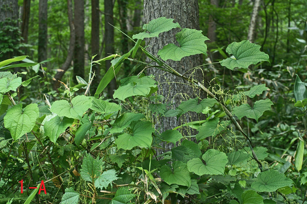 | 写真1A: 葉の形がコシジドコロの特徴を有している株(長野県白馬村沼池尻付近、2010年7月25日)。この地点では、コシジドコロはカラマツ林の中の道路沿いの林縁にごく普通に見られる。道路の法面や伐採跡地に生えている株が多い。しかし、藪の刈り払いや道路の側溝工事のためにツルが切断されている株も少なからずある。