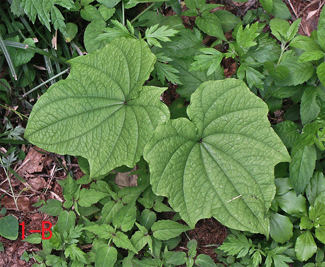 | 1Bと1Cはそれぞれ典型的な葉の形をしているため区別は容易であるが、コシジドコロかキクバドコロか判定が困難な中間的に見える葉をつけている株もある。
