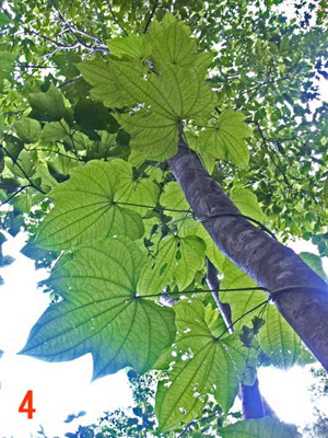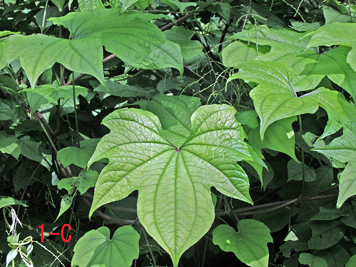 写真4: 葉の形がコシジドコロの特徴を持っている株 (長野県飯山市鍋倉山 標高約 900m。2009年8月23日)。林内のギャップに、ブナの幹にからまって生えている株を下から撮影。 画面のうちの一番下の葉の葉腋に既にカプセルになっている花序がついている。この花序がこの株の最下節の花序である。ここに写っている範囲の下位節の葉は通常のキクバドコロの葉にやや近い形をしているが、上位節の葉ほどコシジドコロの特徴を持つ。