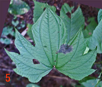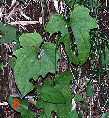 | 写真8: 同所の別株のキクバドコロの下位節の葉。下位節でもコシジドコロに、と言うよりもカエデドコロに酷似した葉をつけているが、花の特徴と、葉柄の付けに突起が無いこととで、カエデドコロではないことがわかる。 |