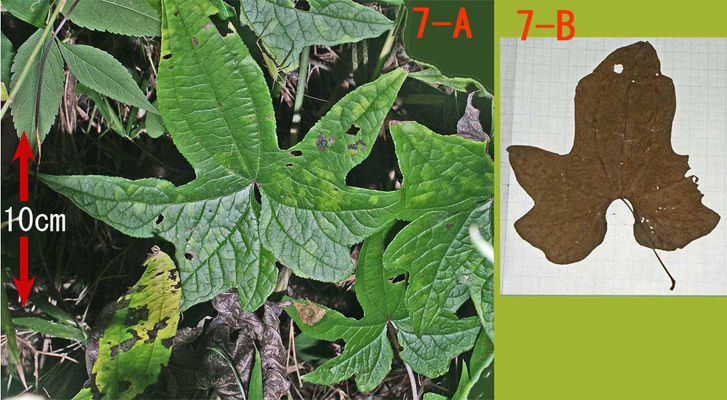 この株の下位節 (おそらく 3 - 4 節め)の葉の形はキクバドコロの葉にいっそう似ている (写真 5: 葉の幅は約17cm)。 |