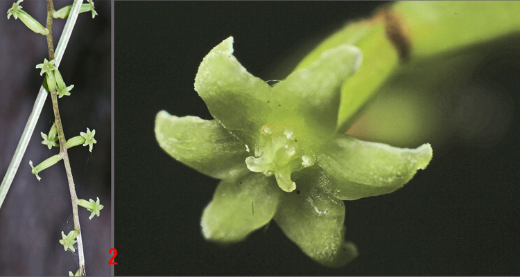| 写真2: コシジドコロのメス花序(左) と メス花 (右)。 |