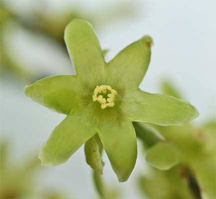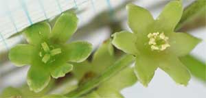 | 左メス花。6個の同格の退化雄蕊の基部に色が着いていない点を除くと、キクバドコロとほぼ同じである。なお、6本の退化雄蕊の先端部は上の写真のように白い。開花後だいぶ時を経ると、この先端部は茶褐色になるが、基部周辺に色は付かない。 右オス花。キクバドコロとほとんど同じである。 |