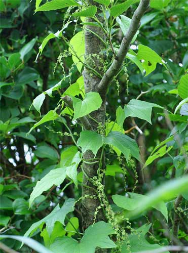 新天地にいち早く進出する性質が強いらしく、サルトリイバラなどとともに、 噴火後あまり年月を経ていない外輪山の内側にたくさん生育している。潅木林 の内部にも少し入っていて、耐陰性はキクバドコロと同じ程度と思える。花期も同じであり、6月初旬から咲き出す。種子の休眠期間が長いこともキクバドコロに似ている。なお、キクバドコロは伊豆七島には生育していない。 外見上キクバドコロとシマウチワドコロを区別することは困難であるが、染色体数と、胚嚢形成の形式に、両種の間で違いがあることが武内により明らかにされている。ヒメドコロやタチドコロにおける染色体数の多型は倍数体の関係にあると考えられる。しかし、キクバドコロは2n=20でありシマウチワドコロは 2n=40 であるものの、葉の気孔の大きさや花粉の様相からは、この両者は単なる倍数体の関係にあるとは考え難い。さらにまた、日本産のヤマノイモ属の大多数は胚嚢形成の型式がタデ型であることに対して、キクバドコロとイズドコロはDrusa型であるのに(Drusa型のこの2例はこの属としては初の観察例)、シマウチワドコロは大多数の種と同じくタデ型であった。これらのことから、 シマウチワドコロはキクバドコロの変種というよりは別系統の種と考えるのが妥当であろうとされ (Takeuchi et al (1970): Chromosome numbers of some Japanese Dioscorea species. Acta Phytotax. Geobot. 24: 168-173: Takeuchi (1998): "On the chromosome numbers and embryo sac formation of some Japanese Dioscorea species" In Araki & Okagami [eds], Dioscorea Research 1, 37-41. など)、頭書の学名はこれに依ったものでる。 |